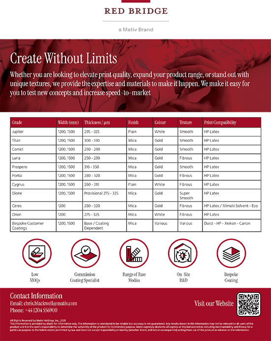 Red Bridge offers a range of wallpaper bases, both smooth and textured, which have print receptive coating, including mica’s, optimized for digital print technology. Our in-house laboratory and production facility can produce tailor made solutions for your needs.